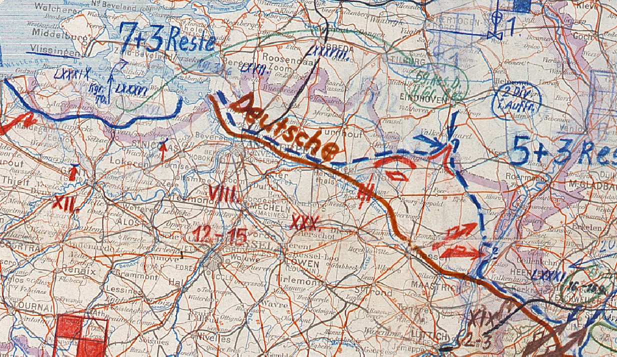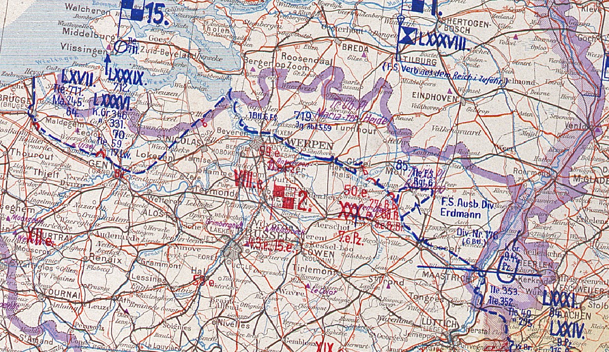 Op deze Duitse stafkaarten zie je links de frontsituatie (blauwe stippellijn) op 10 september 1944. In de Kempen en in Limburg stopt de geallieerde opmars grotendeels aan het Albertkanaal. In vijf dagen tijd verschuift het front zich bijna volledig naar de Zuid-Willemsvaart en het kanaal Bocholt-Herentals. Interessant is de uitstulping tussen Lommel en Neerpelt. Vanuit deze streek wordt in september ’44 het grondoffensief van Operatie Market Garden gelanceerd.